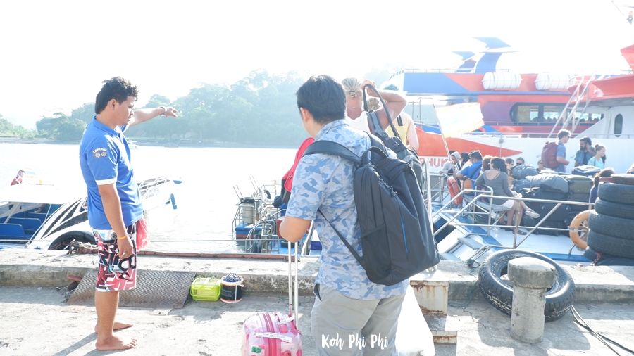 Before a boat departs in 15 minutes, the staff will tell us to get in a boat. As we got in a speed boat to Koh Phi Phi, we had to walk across a big boat to get in a speedboat. The crew came and helped us carry our baggage.