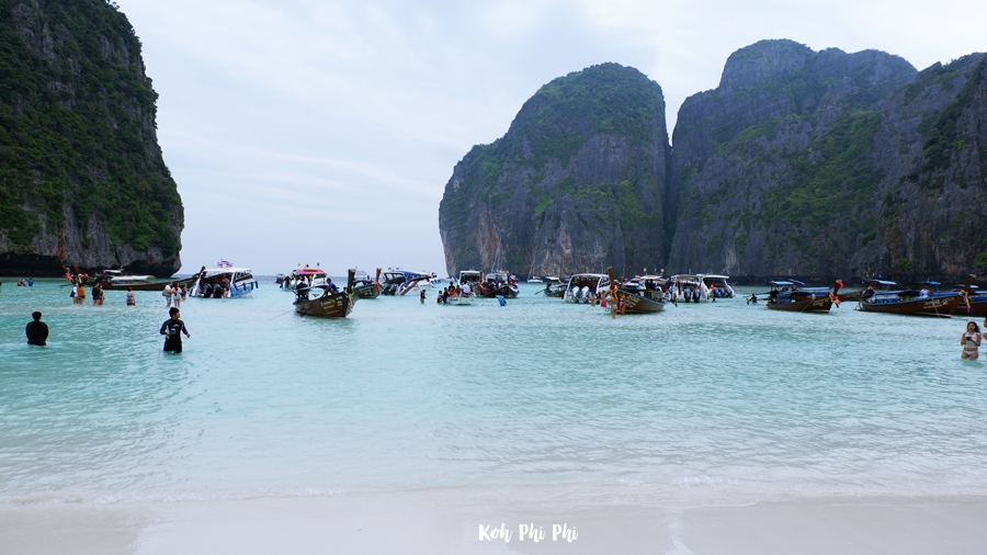 The first bay that we arrived at was Maya Bay. The sea water was very clear, but today it had a light sun. The weather was cool. We looked around and saw only foreigners.