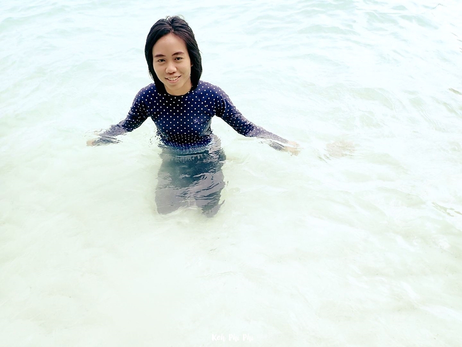 We arrived at the front beach of Monkey Bay before we went back to Phi Phi Don. The water was clear, warm, and not cold at all.
