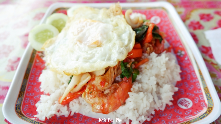 After we got tired from diving, we ordered an easy menu on the island called Thai Basil Stir Fry Seafood With Fried Egg. Each dish is 60+ Baht which was not expensive for us. I can’t remember the restaurant name, but I remember that it was an a la carte restaurant located in the opposite of a water reservoir in the middle of the island. I recommended this restaurant for the cheap menu prices. After we finished our lunch, we went to the view point Phi Phi.