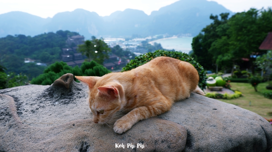 After we took a lot of photos, we had to go back. On the way back, we saw a cute cat lying down and playing on a rock. The weirdness of Phi Phi Don is there are a lot of cats. Every spot on the islands, the cats stay everywhere. Luckily, the cat didn’t cause any trouble for us.