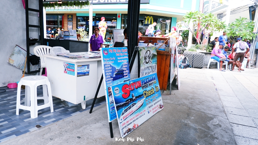 This is a check-in spot for our boat. We went to Koh Phi Phi by a speed boat of the Satun Pakbara Speed Boat Club. The boat departed at 08.30 am. We had to check-in at least 30 minutes before the boat departed. The booth name is Anda. You can check the boat schedule at www.ferryadvice.com (ID:line ferryadvice) for 24 hours.