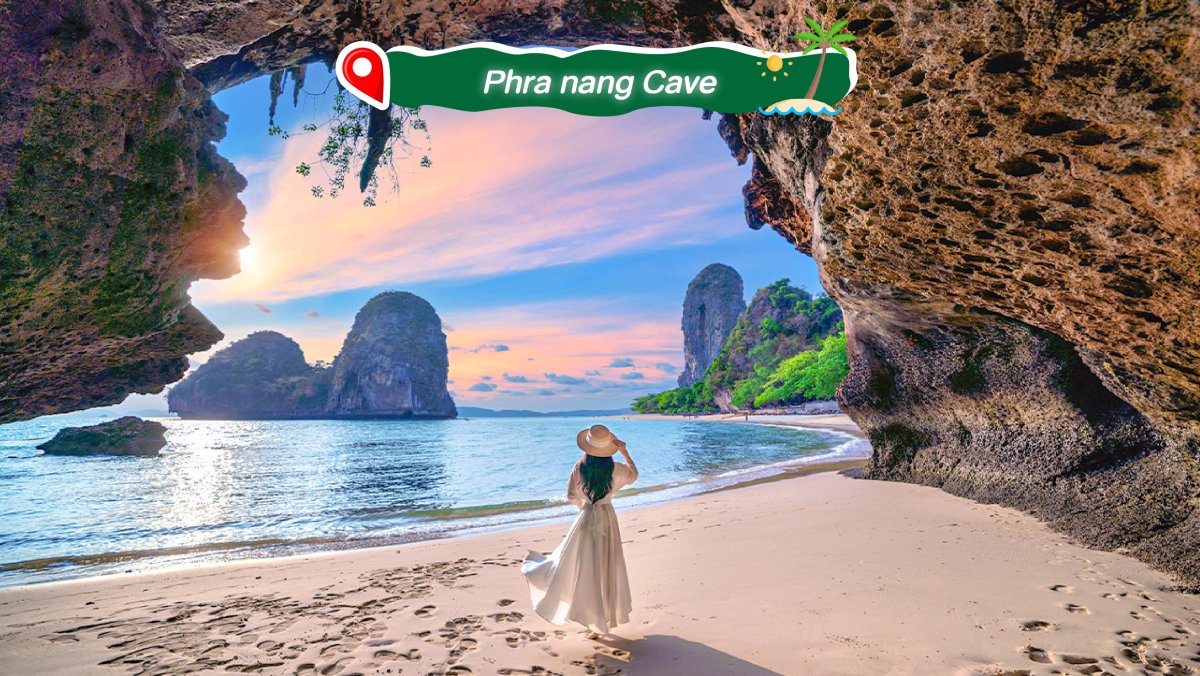 Phra Nang Cave Beach or Phra Nang Cave Bay. It has beautiful beaches, white sand and crystal clear waters, mountain views and limestone cliffs. suitable for swimming or doing various beach activities such as cliff climb, sunbathing, kayaking, seeing the sunset, volleyball beachfront, etc. and another sacred place, Phra Nang Cave Beach has a cave with a shrine of a female goddess or Phra Nang which the fishermen and local people have respected pay blessings before going out to the sea for good luck and fulfillment of wishes