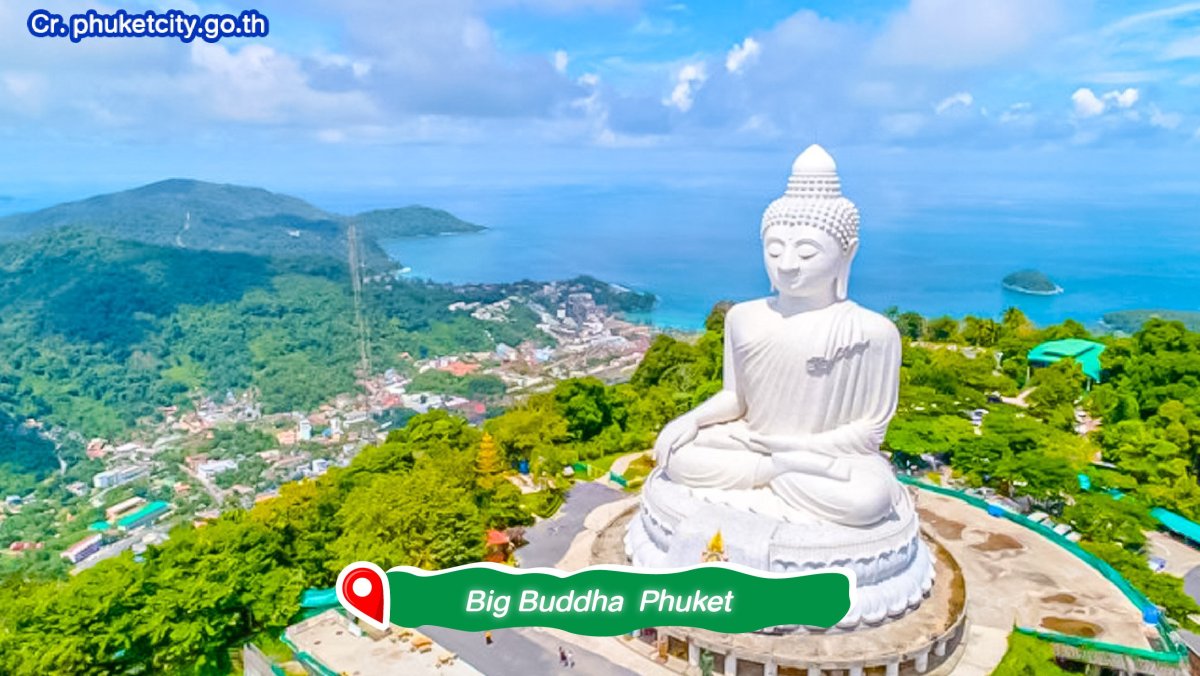 on the mountain in Kathu District. Buddha image in the subduing Mara posture. Large size, width: 25.45 meters, height: 45 meters, reinforced concrete structure decorated with Burmese jade white marble, the weight of white jade marble is approximately 135 tons per 2,500 square meters, visitors can enjoy panorama view throughout Kathu district, In the south of Phuket Island, around Kathu District, Phuket Town, Kata Beach, Karon Beach, Chalong Bay but Please wear polite clothes to visit the temple such as long pants or long skirts