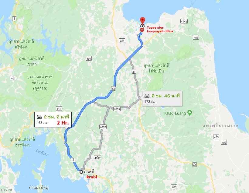 The picture shows the route of bus from Lomprayah office at Krabi to Tapee pier at Suratthani and the route of the ferry boat to crossing to Koh Samui, Koh Phanung, Koh Tao and Koh Nangyuan.
