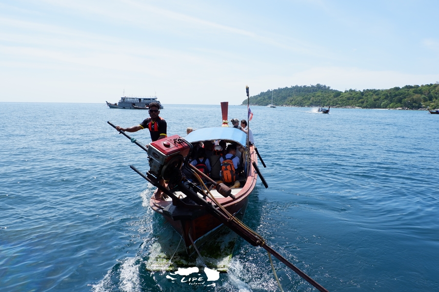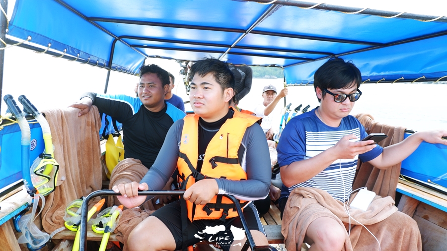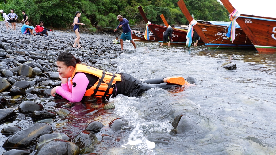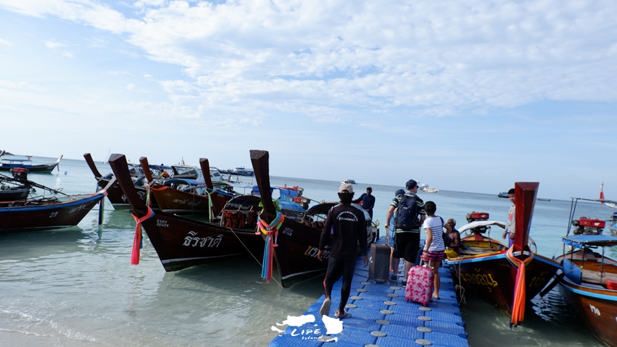 We have to take a longtail boat to the pontoon. Boats cannot dock on the beach because the bottom of the boat is deep and destroys the coral reef on the beach. The long-tail boat fare is 50 baht/person. It is considered that we should help preserve the integrity of the coral reef so that it will be with us for a long time. Other people who come to visit later will find the same beauty as us
