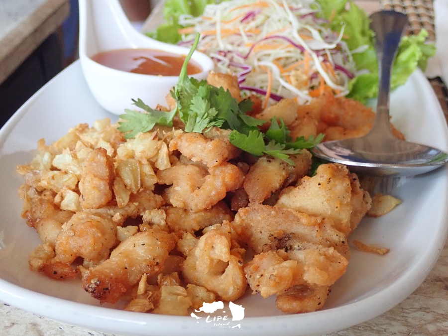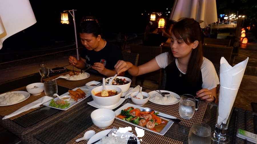 After finishing playing in the water Continue having dinner at the resort. The food menu includes Spicy seafood soup, fried spring rolls, and stir-fried sweet and sour seafood