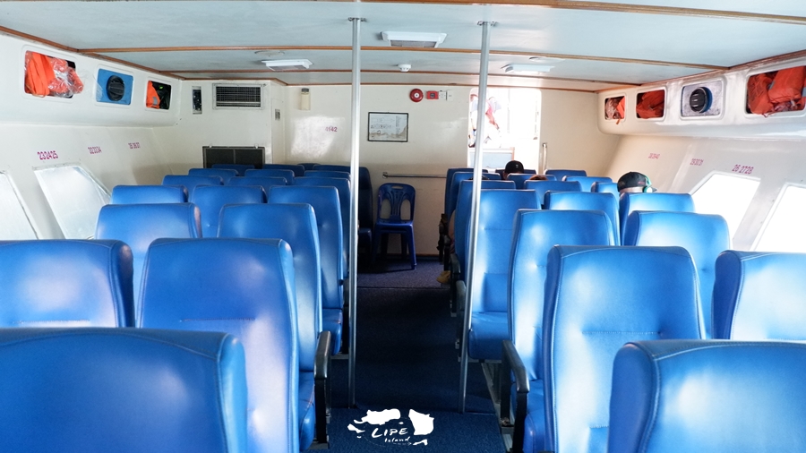 Inside the ferry. The planes are all air-conditioned, have life jackets, and have restrooms inside the boat. It takes about 2 hours to reach Pak Bara Pier. The ferry takes 30 minutes longer than the speedboat