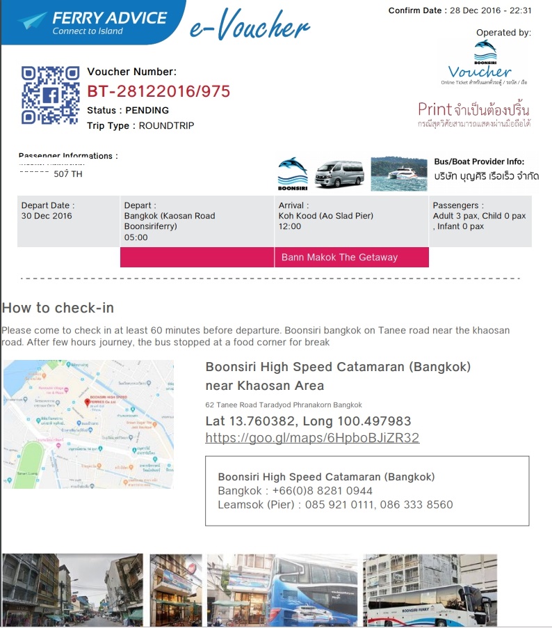 This is a voucher for check in. You can print or show a voucher from your smart phone. Please check in 40 minutes prior to departure time at The Street Hotel, Pattani rd., Bangkok. The customers who is booked from online booking and paid. We will send the voucher to your e-mail and line application within 24 hours.