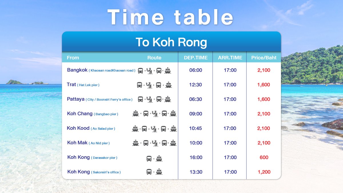 Travel schedule from Thailand to Koh Rong, Cambodia, all routes available.