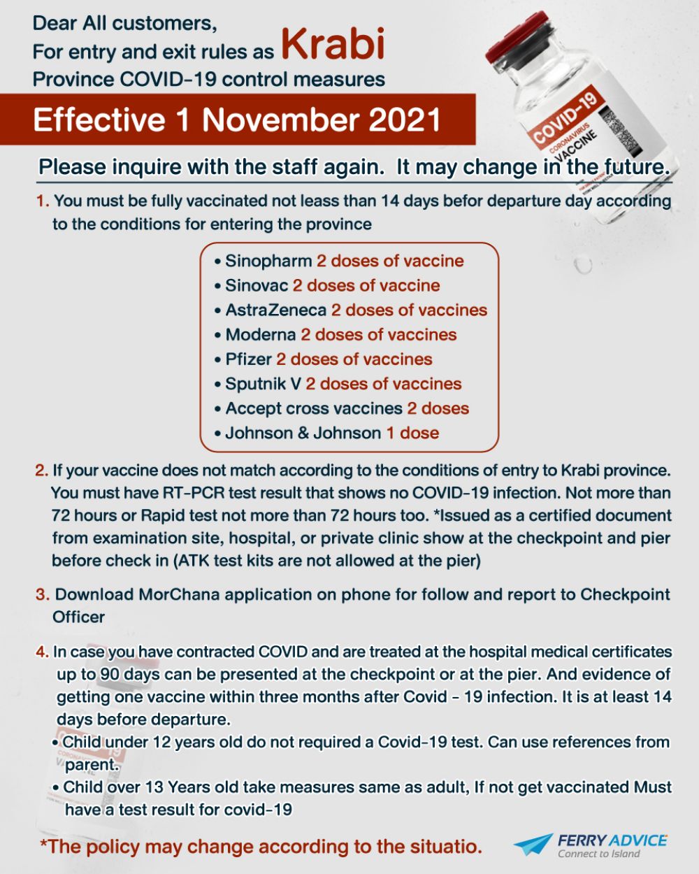 Dear All customers, For entry and exit rules as Krabi Province COVID-19 control measures Effective 1 November 2021