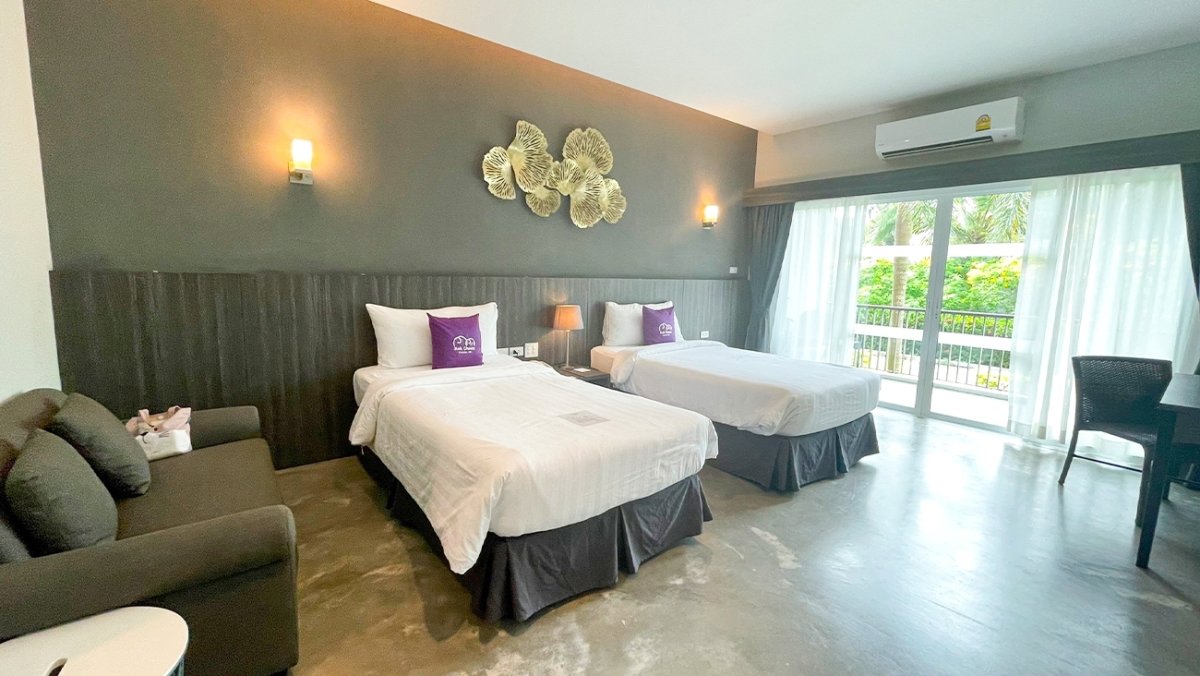 Koh Chang Paradise Hill โรงแรมที่พัก เป็นห้องพักในตึกอาคาร เราพักที่ชั้นล่างสุด มีระเบียงด้านนอกห้องพัก ห้องพักขนาดไม่ใหญ่มาก มีสิ่งอำนวยความสะดวกให้ครบ
