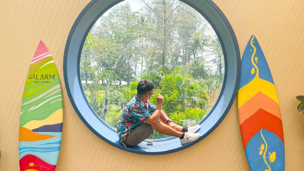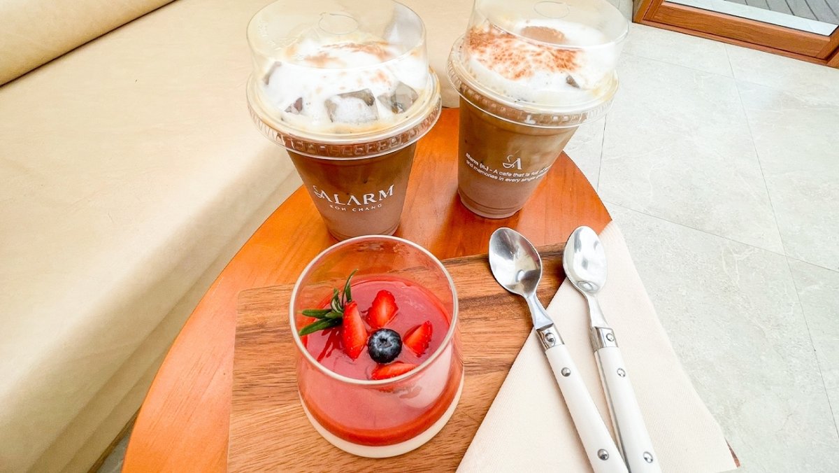 เก็บของเข้าห้องพัก เสร็จ แวะมาหากาแฟอร่อยๆทานที่ร้าน Alarm cafe kohchang. คาเฟ่ที่บรรยากาศดี เหมือนมีชายหาดส่วนตัวในคาเฟ่ ภายในร้านตกแต่งสไตล์ อยู่ในห้องกัปตัลเรือ ร้านกาแฟตกแต่งคุมโทนสีขาวและน้ำตาล