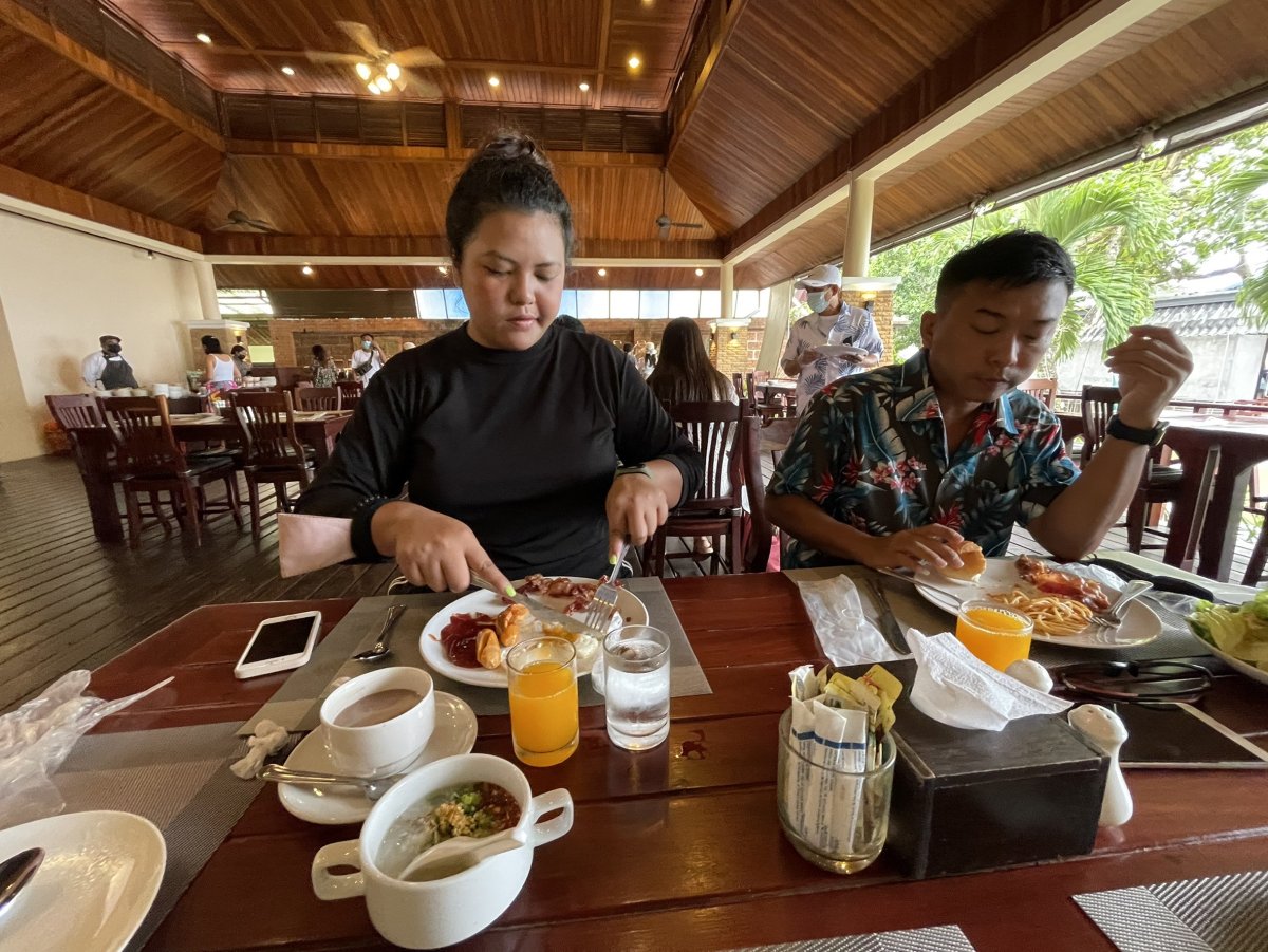 เริ่มต้นมื้อเช้าที่โรงแรมก่อนออกทริปดำน้ำ รีสอร์ทที่เราพักจะมีสองโซน มีถนนตัดผ่าน ตอนเช้าจะมาทานอาหารของโรงแรมต้องข้ามถนนมาอีกฝั่ง เป็นโรงแรมในเครือเดียวกันแต่มีถนนคั้นกลาง