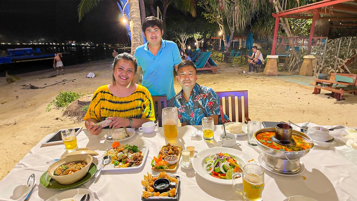 มื้อเย็นทานอาหารที่รีสอร์ท ร้านอาหารของรีสอร์ทฝั่งติดหาด มีกรอสดงกระบองไฟให้รับชม