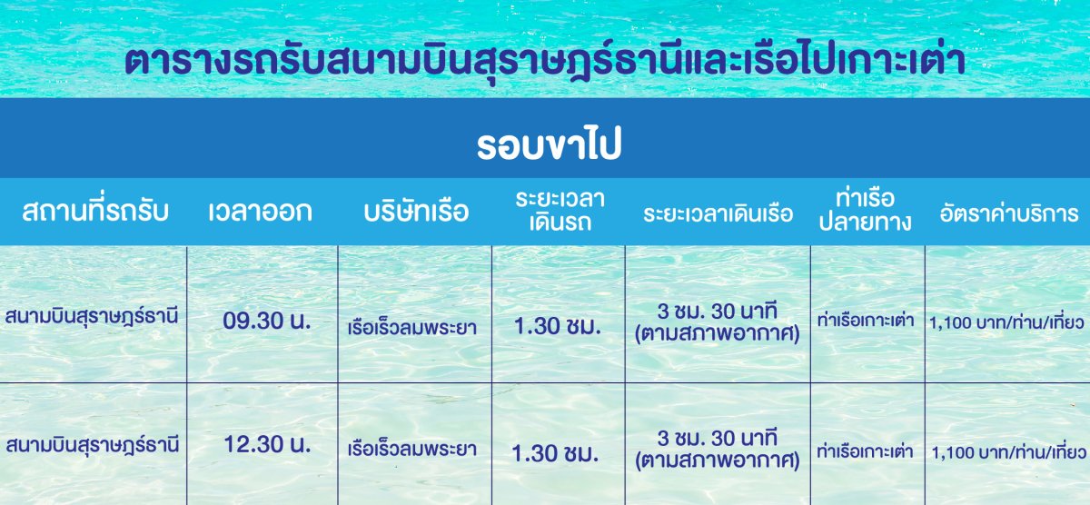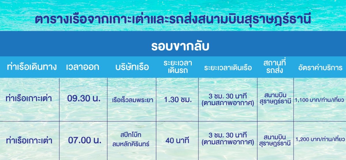 - รอบแรกเวลา 07.00 น. เป็นเรือสปีดโบ๊ทจากเกาะเต่ามาส่งสุราษฎร์ รถจะไปส่งถึงสนามบินประมาณ 10.45 น.