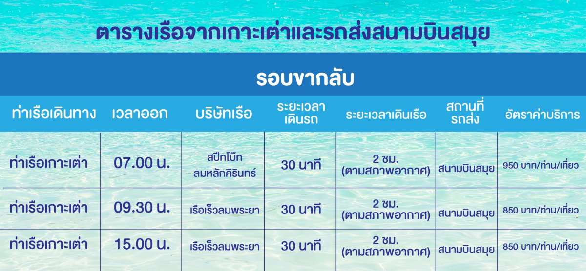 - รอบแรกเวลา 07.00 น. รอบนี้เป็นสปีดโบ๊ทจากเกาะเต่ามาส่งสมุย รถจะไปส่งถึงสนามบินประมาณ 10.00 น.