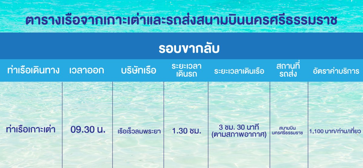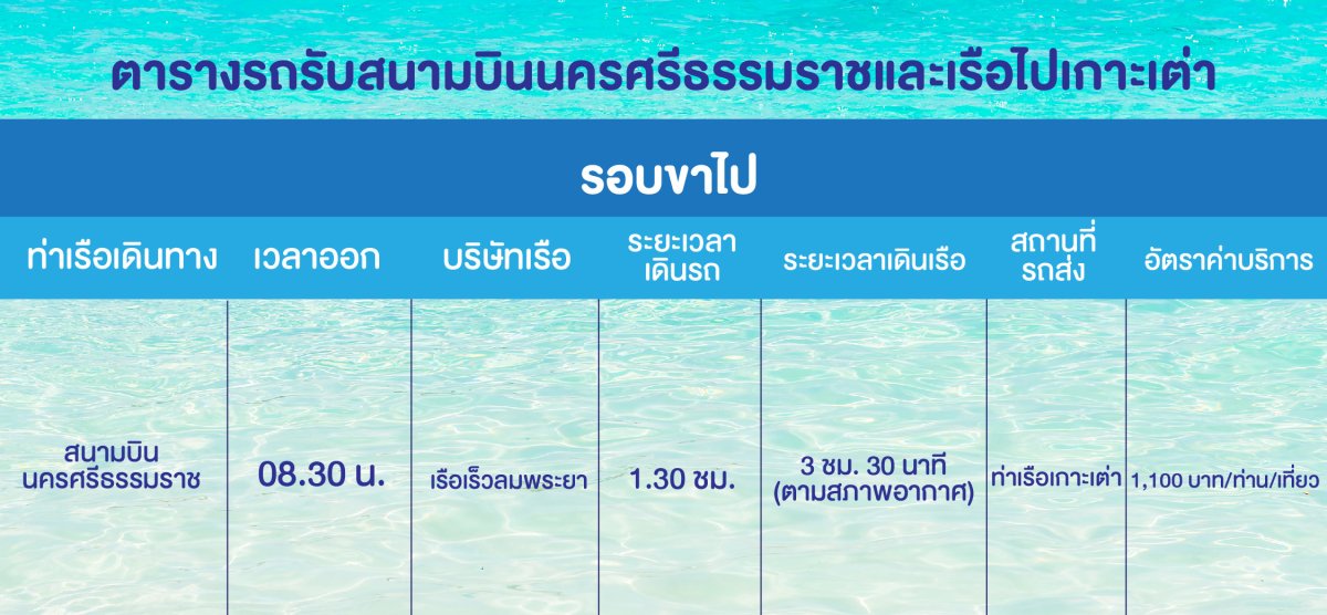 - ขากลับ 09.30 จากเกาะเต่ามาส่งนครศรีธรรมราช รถจะไปส่งถึงสนามบินประมาณ 15.10 น.