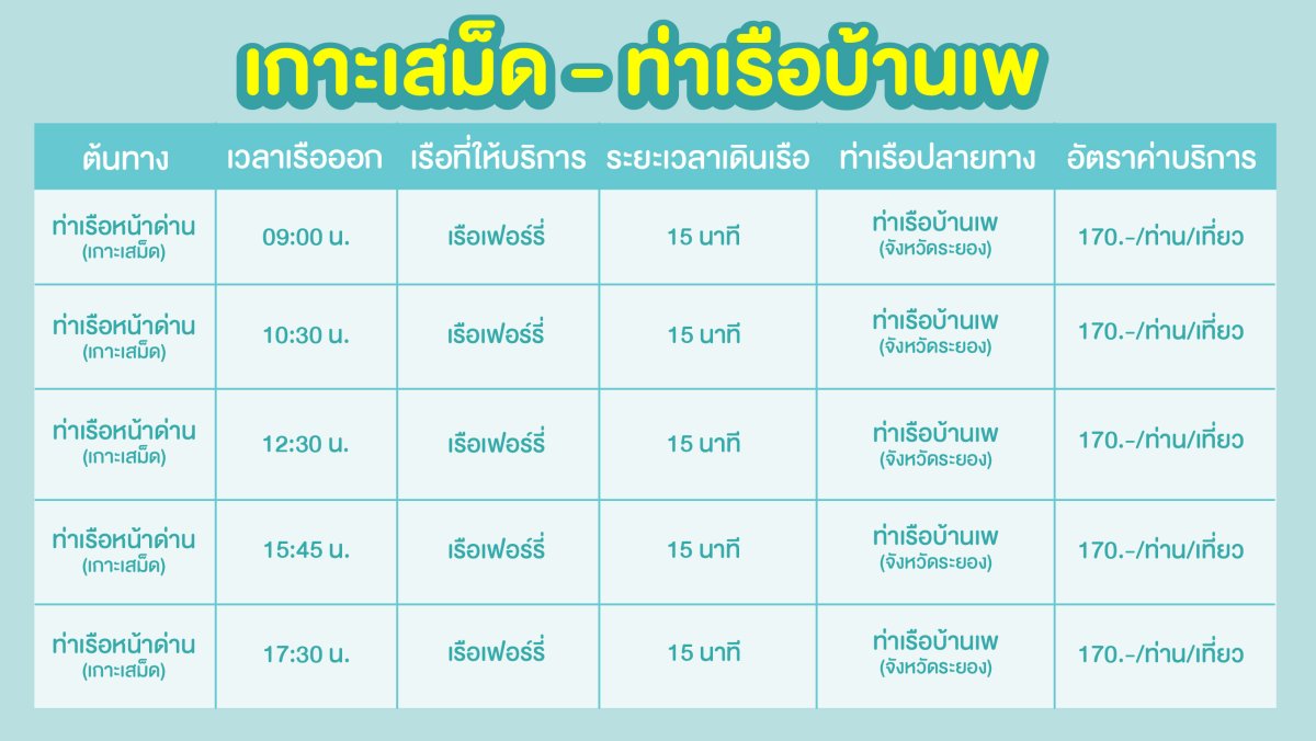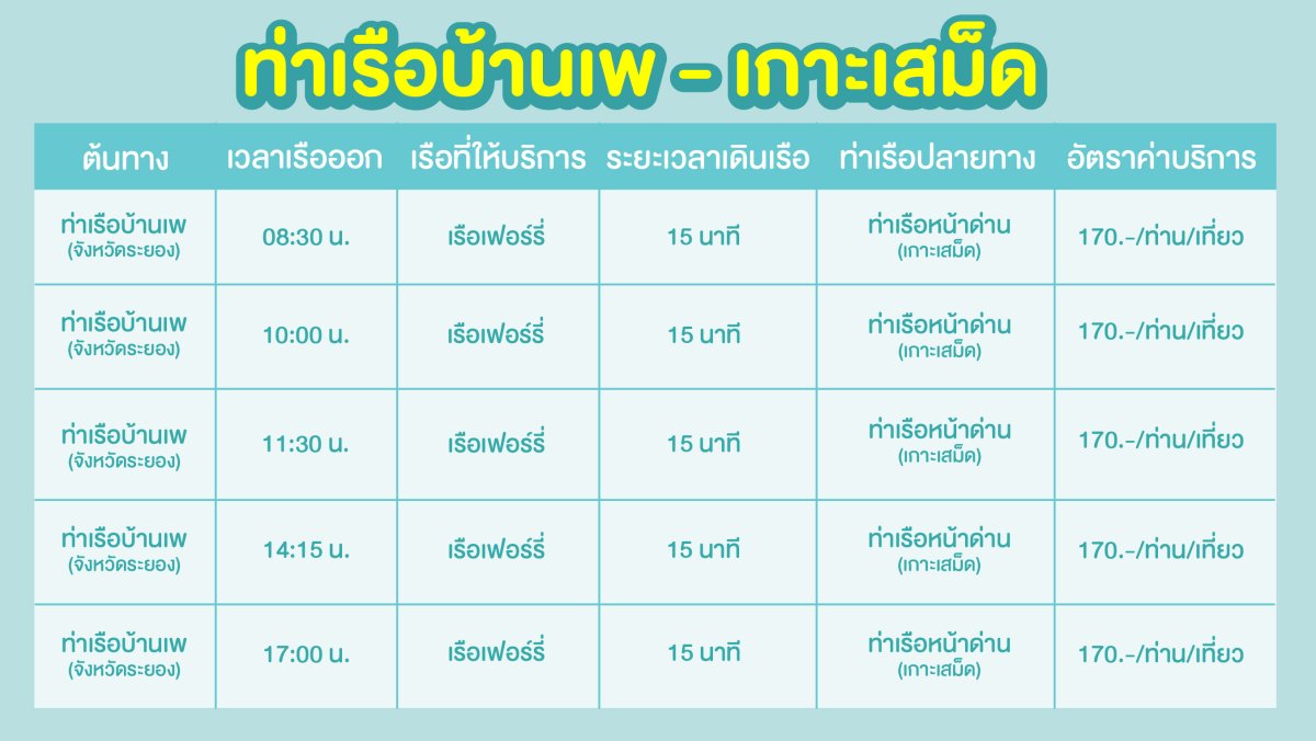 การเดินทางไปเกาะเสม็ดด้วยเรือเสม็ดเฟอร์รี่ เรือเฟอร์รี่ไปเกาะเสม็ดมีให้บริการเพียงลำเดียวเท่านั้น สา...