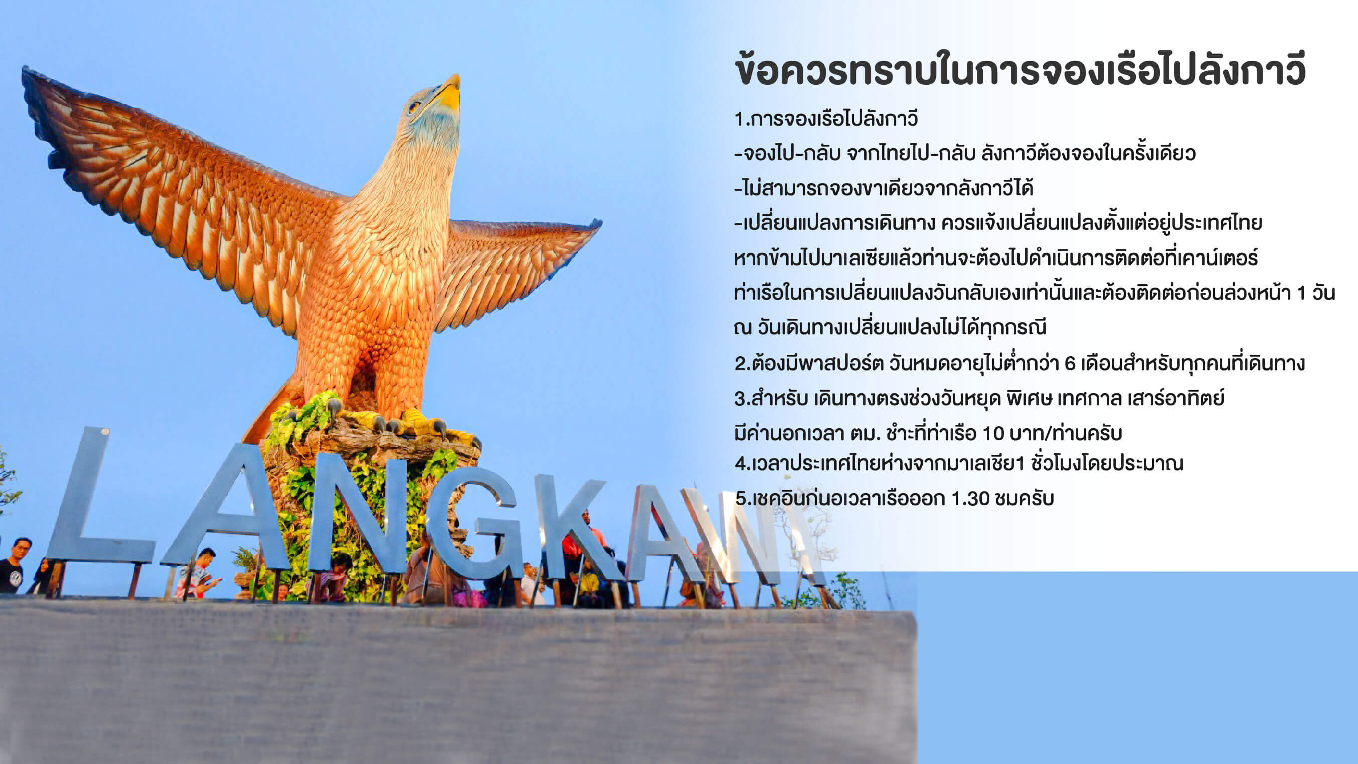 ท่านใดที่ต้องการเดินทางไปยัง ลังกาวี กรุณาสำรองที่นั่งล่วงหน้าเพื่อที่จะไม่ได้พลาดโอกาสในการเดินทางเนื่องด้วยเรือมีที่นั่งจำกัด