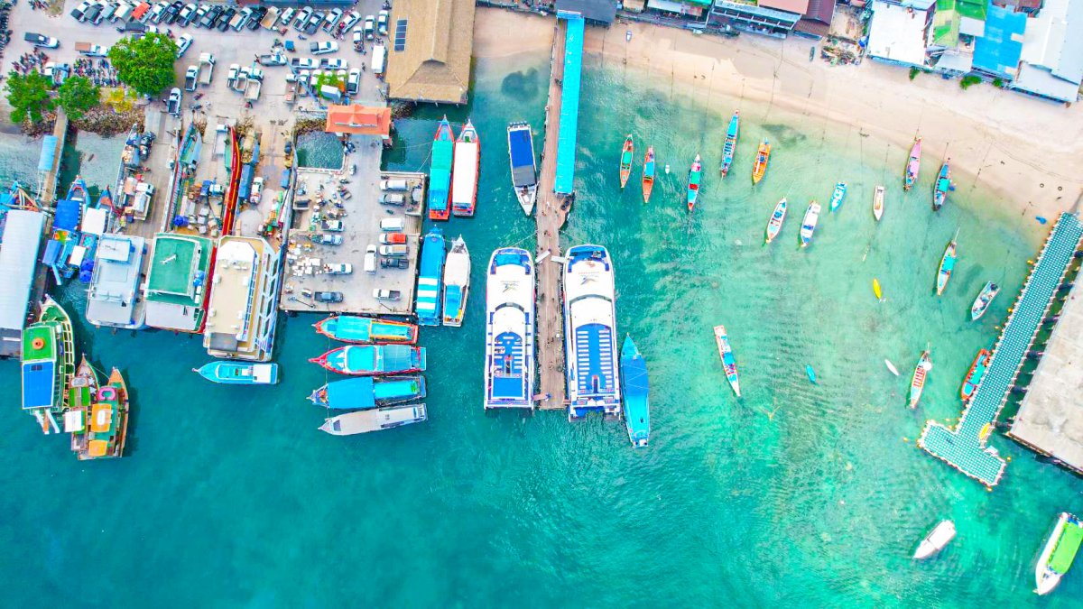 ท่าเรือเฟอร์รี่จะมาจอดส่งผู้โดยสารที่ท่าเรือแม่หาด ท่าเรือหลักแห่งเดียวบนเกาะเต่า