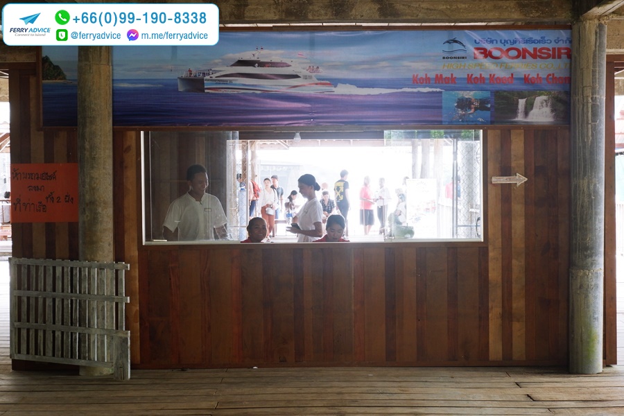 เคาน์เตอร์เชคอิน ออฟฟิศบุญศิริเฟอร์รี่ ที่ท่าเรืออ่าวสลัดผู้โดยสารที่เดินทางออกจากเกาะกูดต้องเชคอินที่เคาน์เตอร์ก่อนขึ้นเรือ