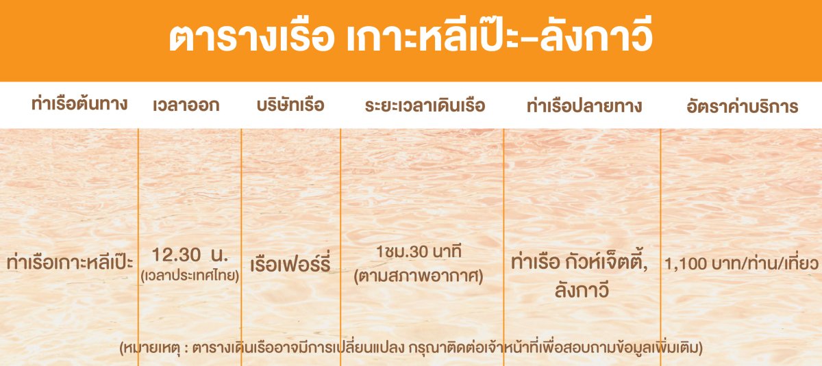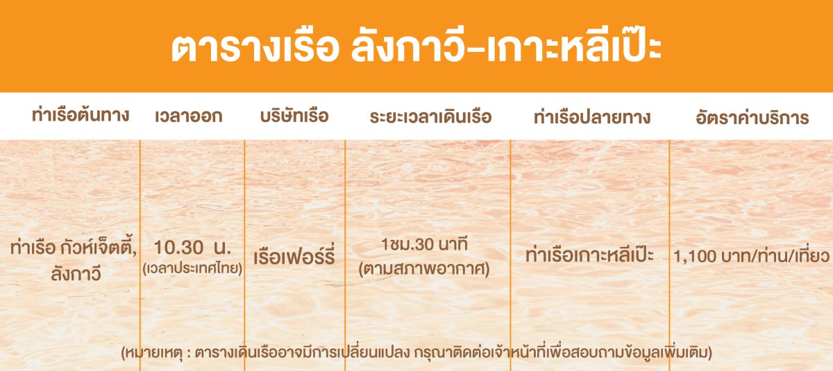 เกาะหลีเป๊ะ อยู่ไม่ไกลจากเกาะลังกาวี สามารถเดินทางโดย เรือบันดาหยา เฟอร์รี่หลีเป๊ะ ลังกาวี ไปยังเกาะลังกาวี 1 รอบต่อวัน ใช้เวลาเดินเรือเพียง 1.30 ชม.