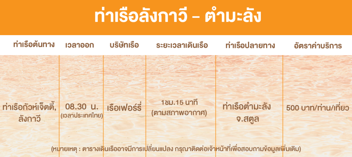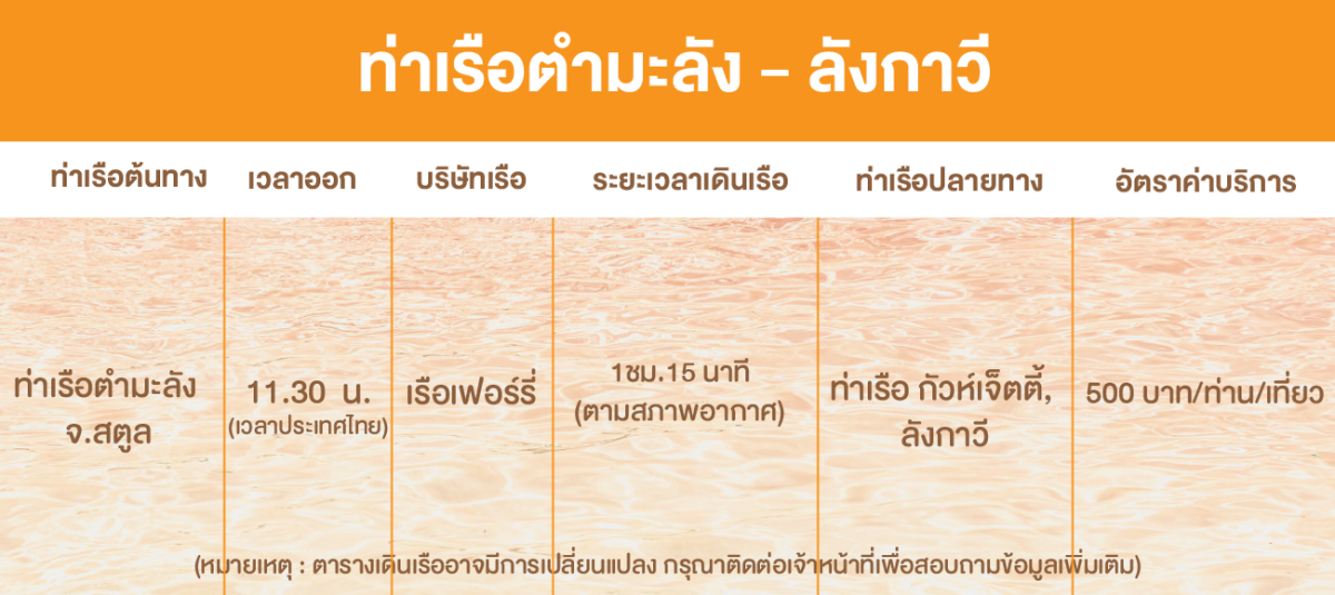 ถึงเป็นอีกหนึ่งเส้นทางที่นักท่องเที่ยวชาวไทยนิยมใช้กันคือ การเดินทางด้วยเรือเฟอร์รี่ที่ท่าเรือตำมะลัง จ.สตูล มีบริการวันละ 1 รอบต่อวัน ใช้เวลาเดินเรือ 1.15 ชม. โดยตารางเดินเรือจะมีการเปลี่ยนแปลงอยู่เสมอตามกระแสน้ำ