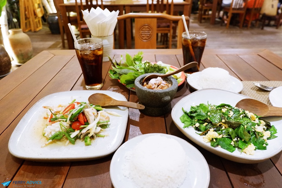 เมนูที่เราสั่งวันนี้ จะมี ผัดไข่ใส่ใบเหลียง ยำวุ้นเส้นทะเล น้ำพริกกุ้ง อาหารที่นี้อร่อยทุกอย่าง แต่น้ำพริกจะเผ็ดไปหน่อย ของทะเลสด กุ้ง ปลาหมึก ตัวใหญ่ หากใครแวะมาเที่ยวกระบี่