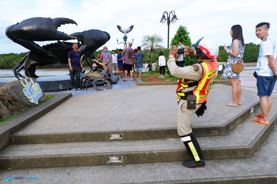 รูปปั้น ปูดำ ได้รับความนิยมมาก ต้องไปยื่นต่อคิวนะจ๊ะ นักท่องเที่ยวรอไปถ่ายเยอะมากค่ะ ถ้าสังเกตุในภาพ ด้านหลัง จะเป็นเขาขนาบน้ำ แต่วันนี้ไม่น่าจะขนาบเพราะน้ำลด