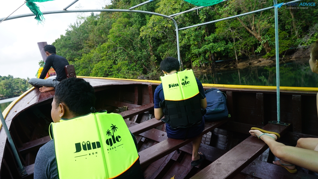 พนักงานรีสอร์ทจะขับรถมาส่งเราที่ท่าเรือค่ะ เพื่อลงเรือไปดำน้ำที่เกาะแรด กรุ๊ปนี้ไปเฉพาะเรา หากวันไหนมีกรุ๊ปอื่นก็อาจจะไปเรือลำเดียวกันค่ะ ภายในเรือมีชูชีพเพียงพอ เราจะนั่งเรือผ่านคลองเจ้าออกไปสู่ทะเล ทางด้านหน้า away resort ค่ะ