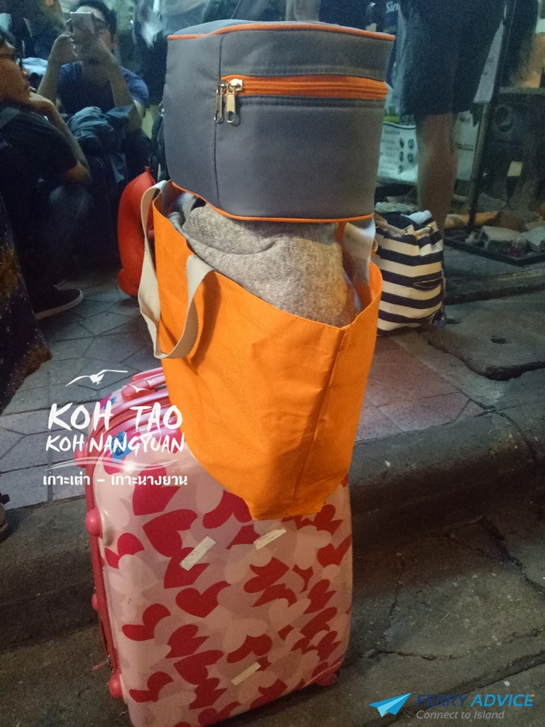 เมื่อเรา check in เรียบร้อยแล้ว เราจะได้ตั๋วรถ และตั๋วเรือ และสติ๊กเกอร์ ติดกระเป๋า เราต้องติดสติ๊กเกอร์ ที่กระเป๋านะค่ะ จะได้ระบุว่าเราลงที่เกาะไหน วันนี้เราไปเกาะเต่าสติ๊กเกอร์จะเป็นสีชมพู
