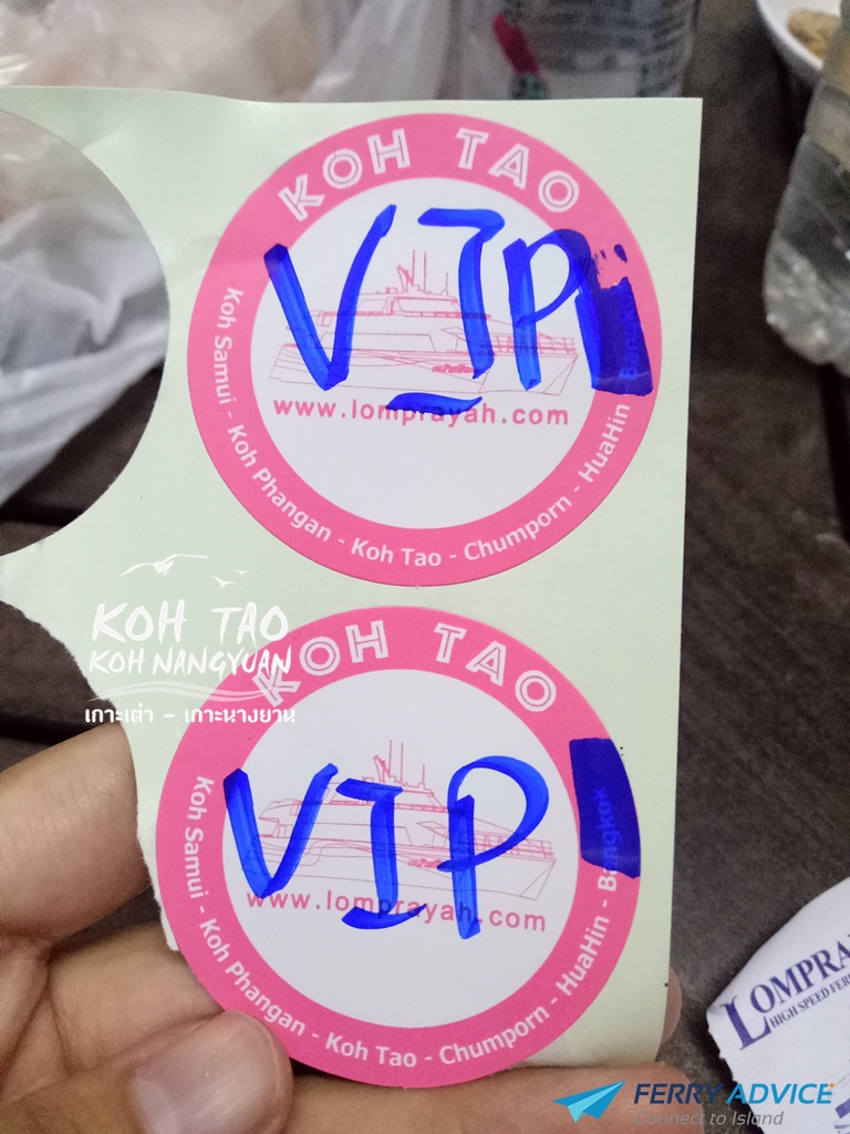 พนักงานจะให้สติ๊กเกอร์ขึ้นเรือค่ะ และเขียนว่า VIP ให้ติดสติ๊กเกอร์ที่เสื้อก่อนขึ้นเรือนะค่ะ
