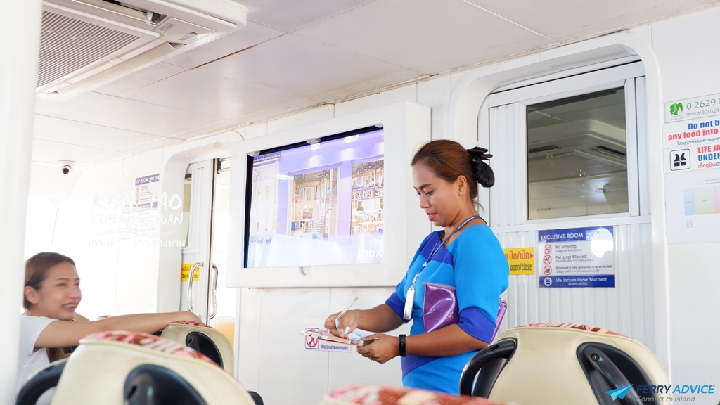 เวลาประมาณ 06.30 น. เราต้องมาเช็คอินที่เคาน์เตอร์ จะมีพนักงานให้บริการ เราต้องไป confirm ตั๋วการเดินทางอีกครั้งค่ะ โดยสามารถเลือกที่นั่ง VIP 100 บาท, Excusive VIP 200 บาท อันนี้ต้องชำระเพิ่มนะค่ะ เพราะราคาตั๋วเรือที่เราชำระในการจองออนไลน์ จะเป็นที่นั่งชั้นธรรมดาทั้งหมดค่ะ (ถ้าไม่ได้แจ้งที่ท่าเรือ เมื่อขึ้นไปบนเรือแล้วคุณนั่งโซน VIP ชั้น 2 จะมีพนักงานชี้แจงและเรียกเก็บบนเรือก็ได้เช่นกันคะ)