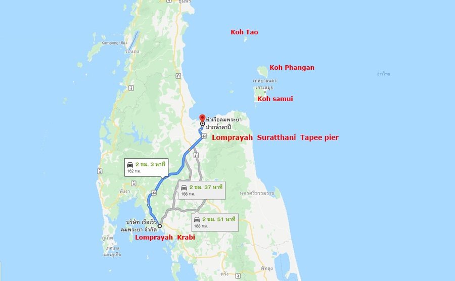 การเดินทางจาก ออฟฟิศลมพระยากระบี่ ไปยังจ.สุราษฎร์ธานี ท่าเรือดอนสัก นั้นใช้เวลาเฉลี่ย ประมาณ 2 ชม.30 นาทีโดยประมาณ