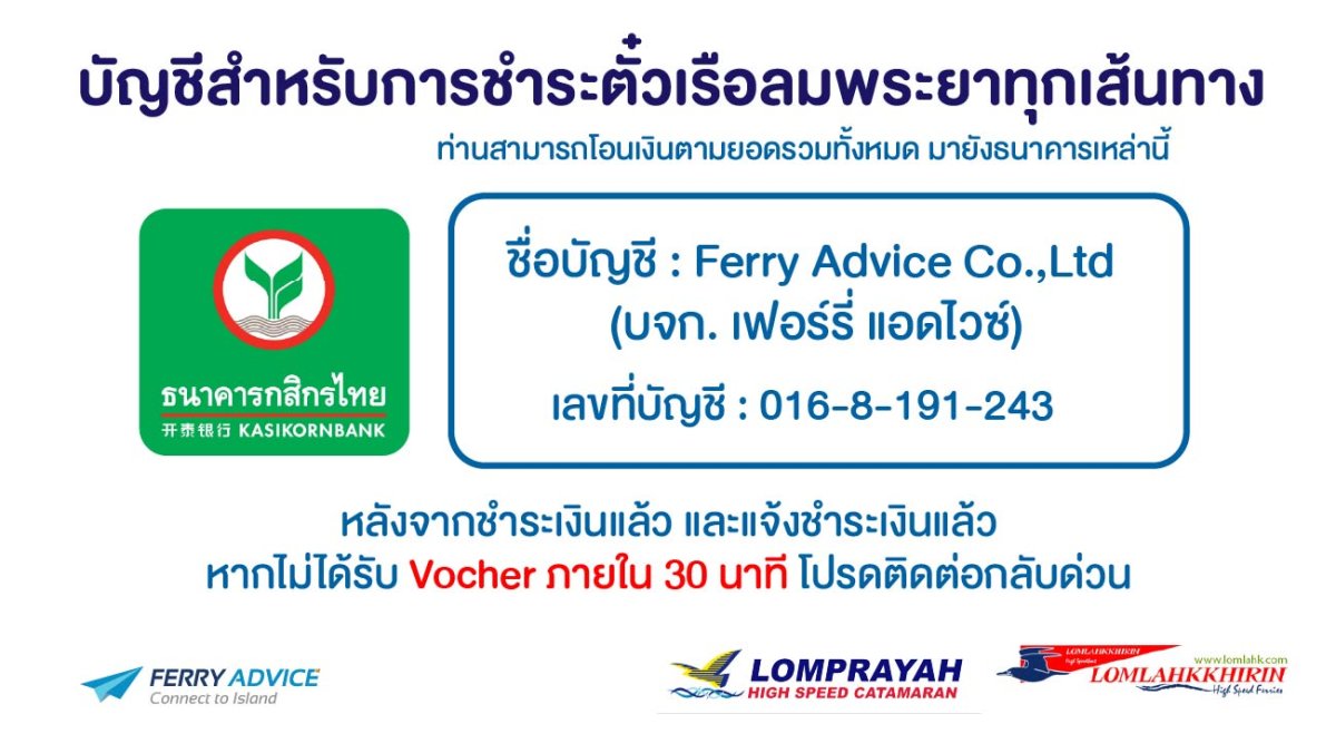 | ต้นทาง | เวลาเรือออก | เวลาถึง | ปลายทาง | อัตราค่าบริการ |