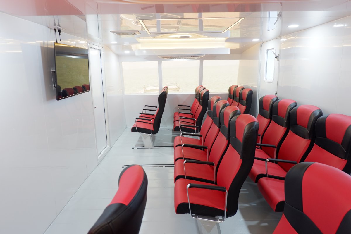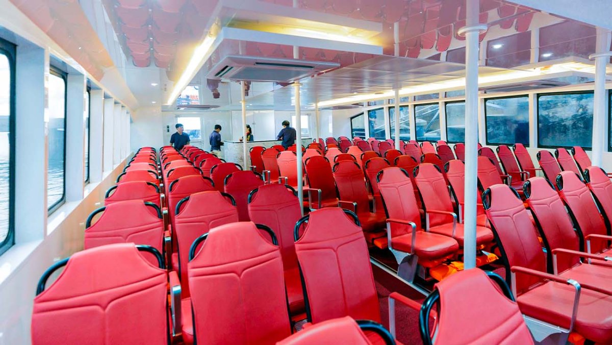 ที่นั่งห้องโดยสาร ชั้นปกติ ปรับอากาศ บริเวณด้ายท้ายเรือมีห้องน้ำให้บริการ
