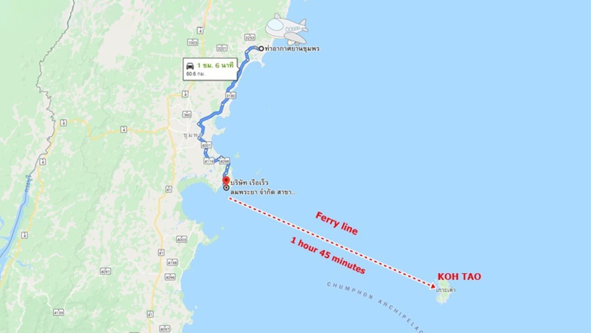 การเดินทางจากสนามบินชุมพรไปเกาะเต่า ให้บริการโดยบริษัท เรือเร็วลมพระยา และ ให้บริการรถรับสนามบินชุมพร วันล่ะ1 รอบ เวลา 09.00 น . เปิดให้ บริการรถรับสนามบินชุมพรไปเกาะเต่า สำหรับท่านที่สำหรองที่นั่งล่วงหน้าเท่านั้น จึงจะมีรถไปรับที่สนามบิน
