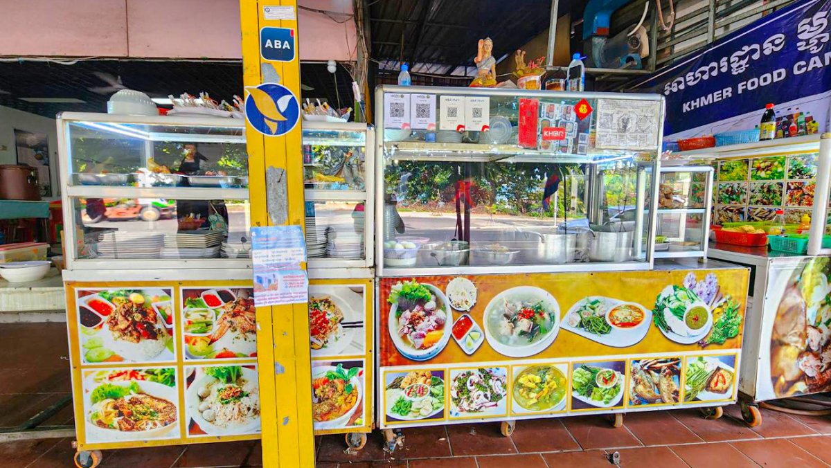 เดินตลาดเสร็จแวะมากินข้าวก่อนเดินทางไปท่าเรือ เพื่อลงเรือไปสีหนุวิลล์ ร้านอาหารคล้ายตามสั่งในประเทศไทย ราคาเฉลี่ยจานล่ะ100 บาท
