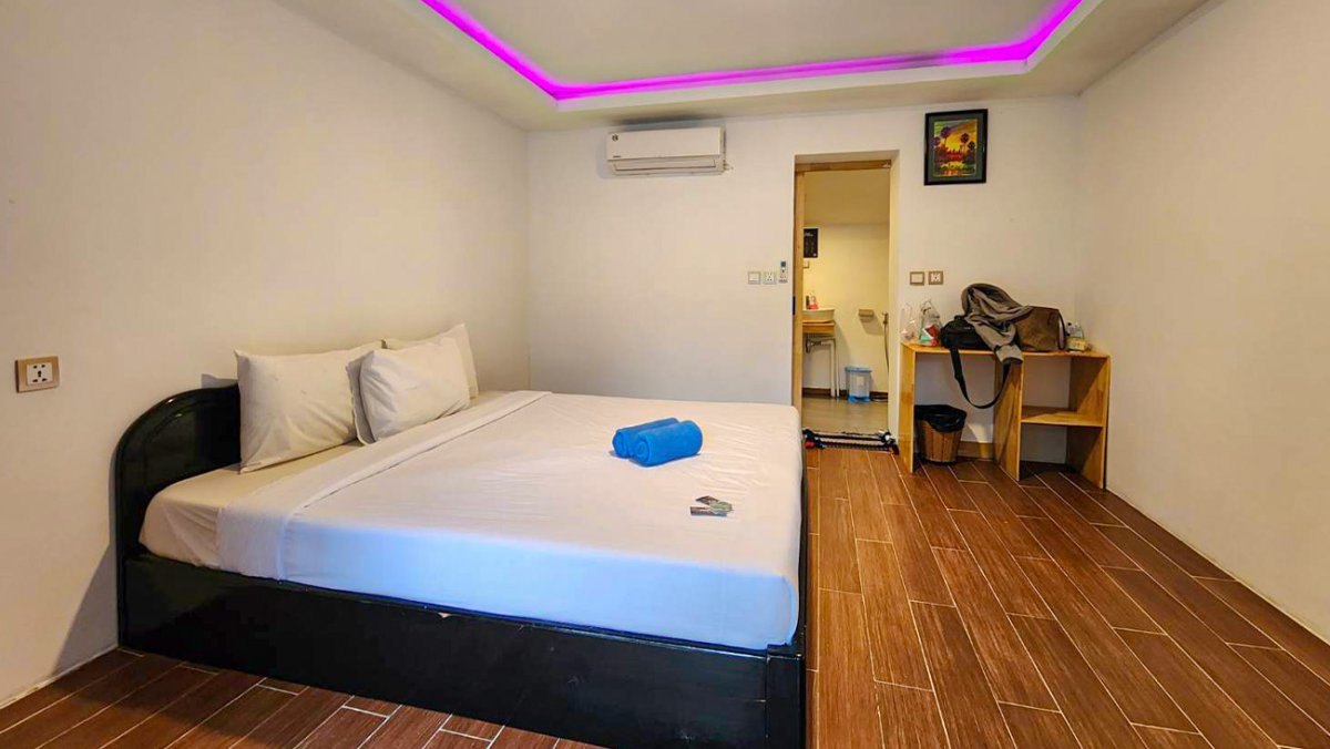 ห้องนอนค่อนข้างใหม่มาก มีไฟเพดาน เปลี่ยนสีได้ มีสีสัน ดูห้องพักจากด้านนอกจะค่อนข้างดูเก่า แต่ข้างในห้องถือว่าสะอาดหน้าพัก