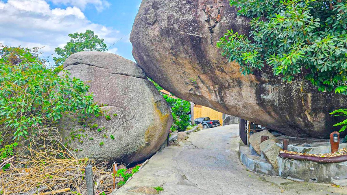 ทางเข้าจะชันนิดนึง มีหินก้อนใหญ่ สองก้อน เอนมาหากัน ก็ต้องมุดเข้าช่องนี้เพื่อเข้าไปรีสอร์ท  บนเกาะเต่าจะเป็นหินก้อนใหญ่ๆ หากทำที่พักรีสอร์ทจะมีสร้างบริเวณไล่เขา ลัดเลาะก่้อนหิน หินก้อนใหญ่สะกัดยาก เลยต้องทำทางเรา หรือที่พักตามซอกหิน อันนี้ถามจากคนงานบนเกาะนะคะ