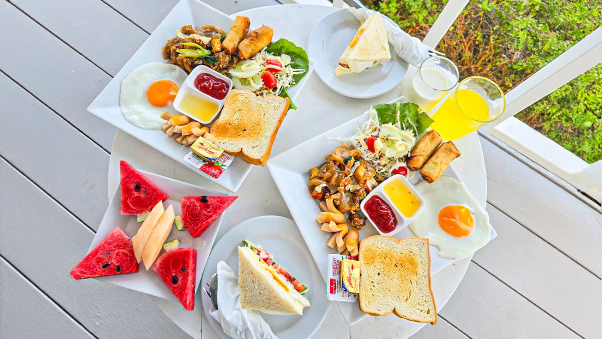 มื้อเช้าที่ห้องพัก คือตอนที่มาพักนักท่องเที่ยวเข้าพักที่รีสอร์ทน้อย พนักงานรีสอร์ทจัดเมนูเชตอาหารมาเสริฟให้ถึงห้อง ตอนแรกนึกในใจ คงแบบอาหารจานเดียวละนะ เข้าใจช่วงคนน้อยก็ต้องปรับเมนูตามจำนวนคนเข้าพัก ที่ไหนได้จัดมาซะชุดใหญ่ไฟกระพริบ นี่กินไม่หมดนะ