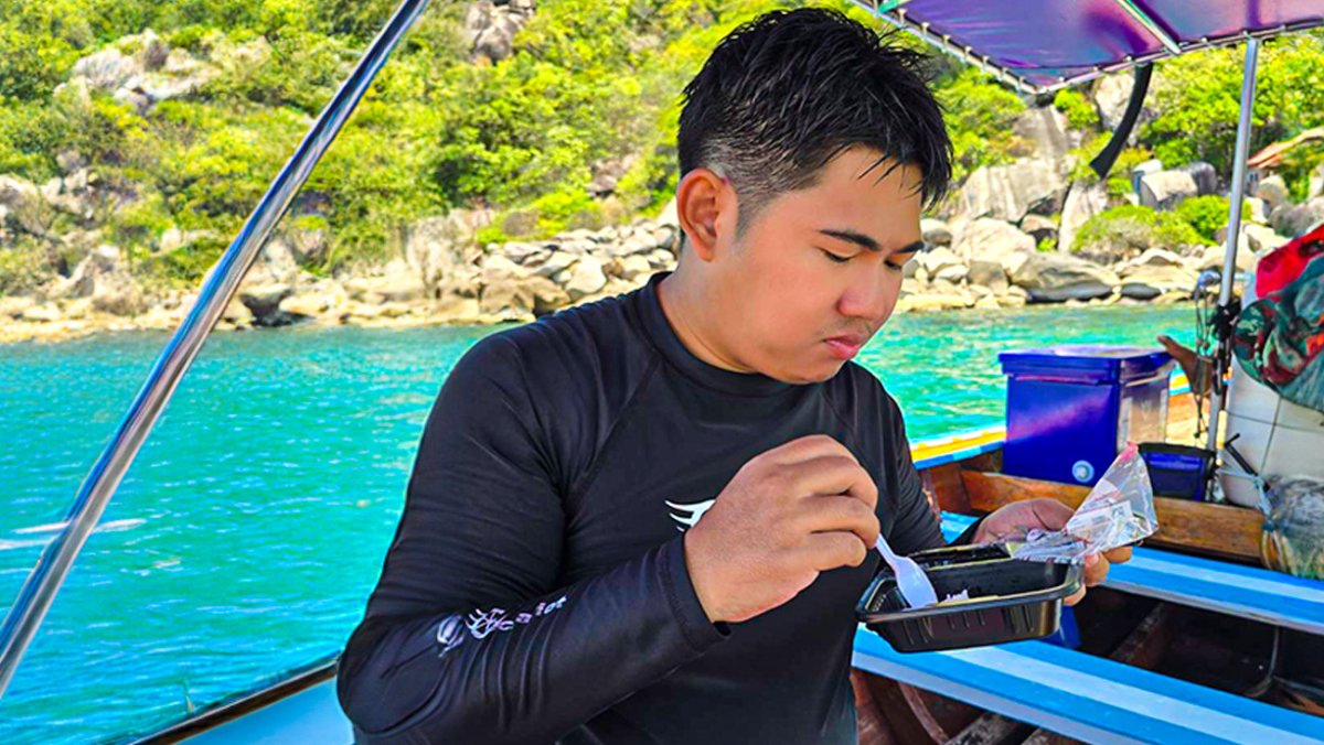 แวะกินข้าวกล่อง ก่อนออกดำน้ำต่อ ทริปไพรเวทนี้ไม่รีบเร่งนะคะ ไปเรื่อยๆ แต่บนเรือไม่ได้มีอาหารให้นะ เราเตรียมมาเอง ก่อนมาขึ้นเรือก็แวะซื้อข้าวเซ่เว่น และน้ำเตรียมมาให้พร้อม