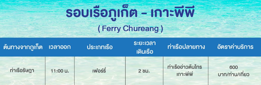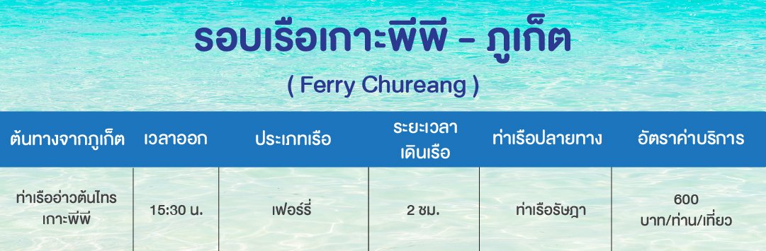 เรือชูเรียง เรือเฟอร์รี่ให้บริการเดินเรือไปยังเกาะพีพี เปิดให้บริการทุกวันใช้เวลาเดินทางจากภูเก็ตไปยังเกาะพีพี ประมาณ 2 ชั่วโมง