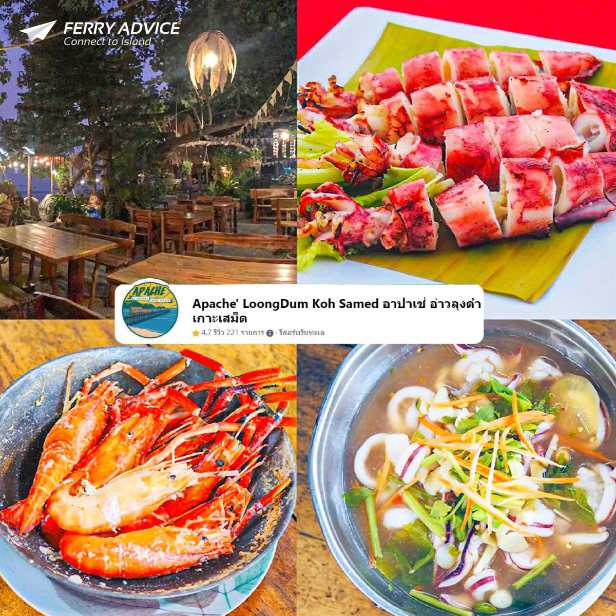 ร้านอาหารภายในอาปาเช่รีสอร์ท เกาะเสม็ด เป็นร้านอาหารเก่าแก่ชื่อดังประจำเกาะเสม็ด ภายในบรรยากาศสบายๆ เป็นกันเอง นอกจากยังเหมาะแก่การรับประทานอาหารแล้ว ยังเหมาะแก่การนั่งชิวริมหาดอีกด้วย โดยอาหารที่นี่จะมีทั้งอาหารจานเดี่ยว อาหารไทยดั่งเดิม และอาหารทะเลให้เลือกรับประทาน เมนูเด็ดของที่นี่ก็จะมี ปลากระพงสองใจ,ห่อหมกทะเลมะพร้าวอ่อน,ฉู่ฉี่ทะเล,ทะเลผัดฉ่า,ไก่ทอดสมุนไพร