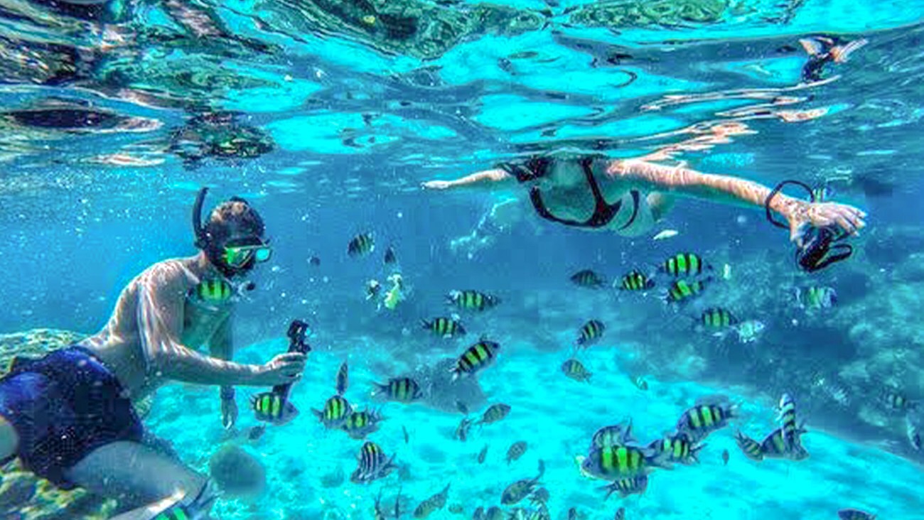 ฝูงปลาเสือตอ และนักท่องเที่ยวที่มาดำน้ำ สัมผัสธรรมชาติใต้ท้องทะเล